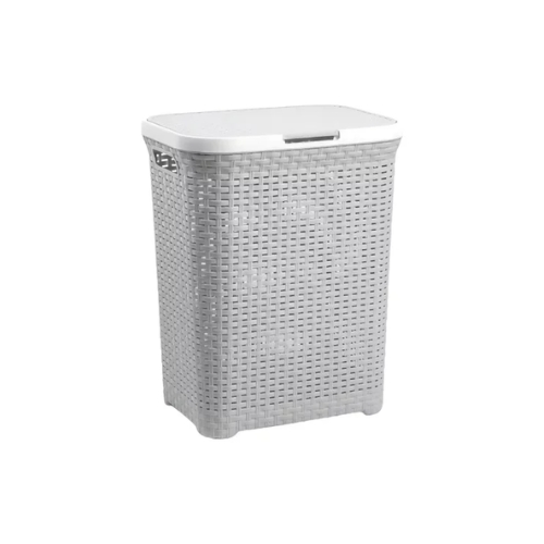 Cesto plástico ratán de 62 lts. para organización y almacenaje, con tapa abatible, y asas para facilitar su transporte.