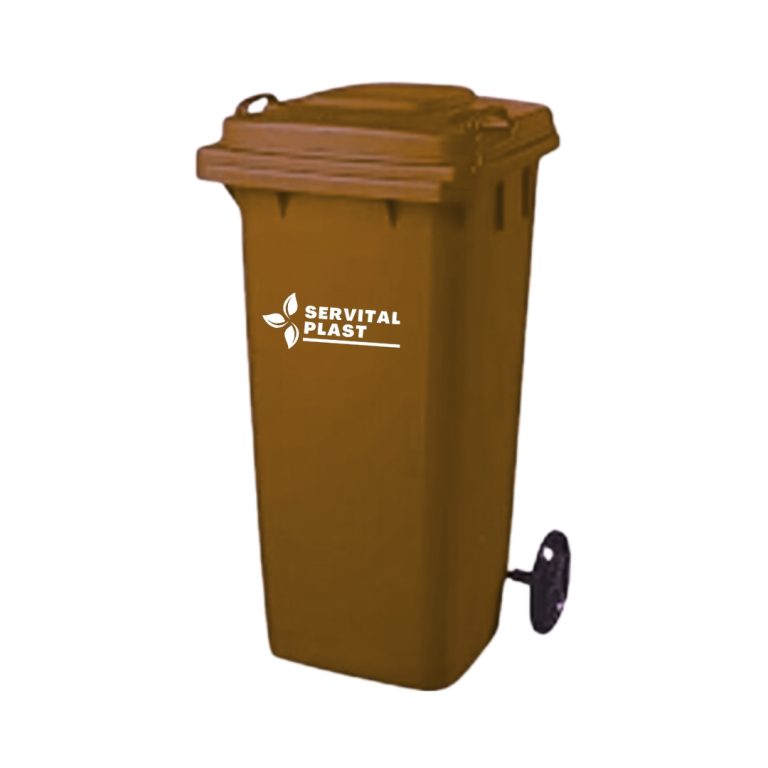 Contenedor de basura de 120 lts marca Servital Plast. Cuenta con tapa abatible y 2 ruedas de goma de 200 mm.